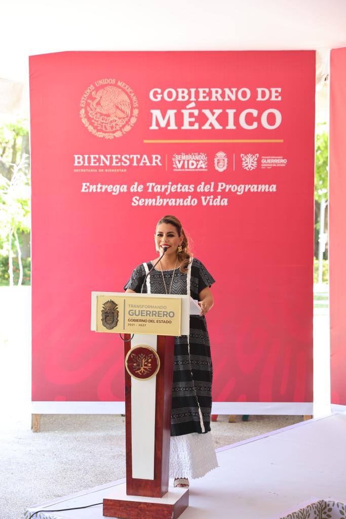 Acapulco, Gro., 07 de octubre de 2022.- “Tenemos muy claro que, generando oportunidades, generando bienestar y generando empleo, vamos a impulsar el desarrollo”, señaló la gobernadora Evelyn Salgado Pineda durante el evento de entrega de 542 tarjetas a igual número de beneficiarios, del programa Sembrando Vida.