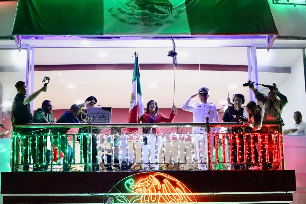 “¡Viva la independencia de México! ¡Vivan los héroes que nos dieron patria y libertad! ¡Viva Hidalgo! ¡Viva Morelos! ¡Viva Allende! ¡Viva Aldama! ¡Viva Josefa Ortiz de Domínguez! ¡Viva Leona Vicario! ¡Vivan los Galeana! ¡Vivan los Bravo! ¡Viva don Juan Álvarez Hurtado! ¡Viva Vicente Guerrero! ¡Viva la Cuarta Transformación! ¡Viva el Estado de Guerrero! ¡Viva Acapulco! ¡Vivan los acapulqueños! ¡Viva México!” gritó Abelina López Rodríguez desde el balcón, ondeando la bandera nacional, junto a representantes de las fuerzas armadas.