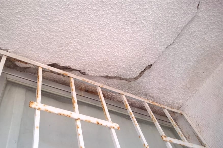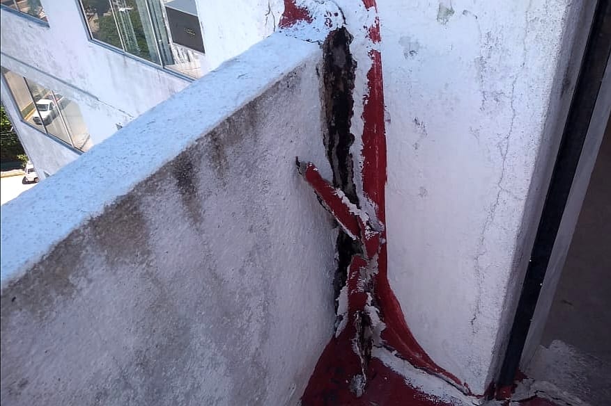 En el fraccionamiento Las Playas, se verificó la estructura de un edificio departamental, se recomendó la restauración del acceso a la azotea, presenta grietas, fisuras y desprendimiento de concreto en la unión de escalones y columnas.
