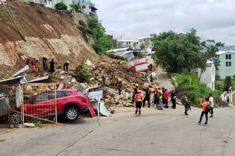 Rescatistas del estado de Querétaro, Oaxaca, así como del Ejército Mexicano y Bomberos de Acapulco unieron fuerzas para buscar a una mujer y su hijo, quienes posiblemente se encuentran atrapados bajo escombros después del colapso del muro de piedra en la unidad habitacional Infonavit Alta Progreso.