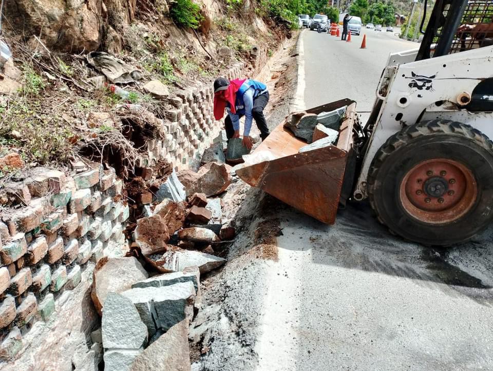 A primera hora de este domingo, se iniciaron las labores de demolición de rocas de gran tamaño que representaban un peligro para conductores, para lo cual se utilizó maquinaria pesada, un camión de 7 metros cúbicos, un bobcat y un compresor; además de llevar a cabo limpieza en cunetas y zanjas para evitar el taponamiento con desechos en esta temporada de lluvias.