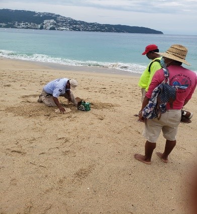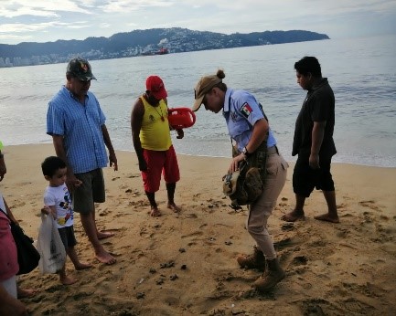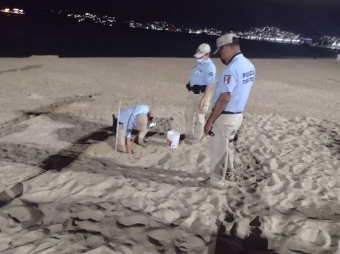 Acapulco, Gro., 23 de agosto de 2022.- A fin de preservar una de las especies en peligro de extinción, personal de la Secretaría de Seguridad Pública (SSP), realiza recorridos en la franja de arena de la bahía para resguardar los huevos de las tortugas que arriban a desovar en esta temporada en Acapulco.