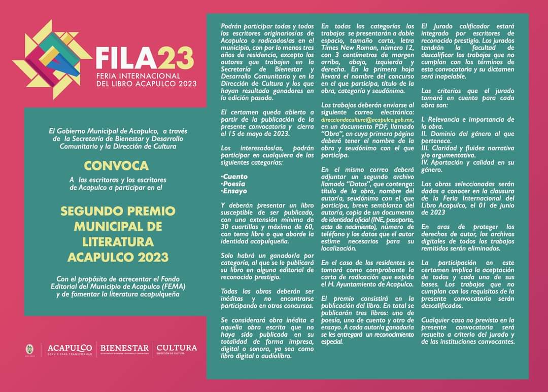 Acapulco, Gro., 02 de mayo de 2023.– En el marco de la Feria Internacional del Libro “Acapulco 2023”, a celebrarse del 27 de mayo al 01 de junio, la Secretaría de Bienestar y Desarrollo Comunitario, dirigida por Leticia Lozano Zavala, y la dirección de Cultura de Acapulco, convocan a escritoras y escritores acapulqueños, participar en el “Segundo Premio Municipal de Literatura Acapulco 2023”, cuyo objetivo es acrecentar el Fondo Editorial del Municipio de Acapulco (FEMA) y de fomentar la literatura acapulqueña.