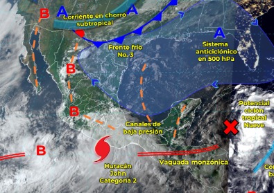 Para esta noche y madrugada del martes, el huracán John del océano Pacífico se aproximará lentamente a las costas de Guerrero y Oaxaca, ocasionará lluvias puntuales extraordinarias en Guerrero y Oaxaca; torrenciales en Chiapas; intensas en Puebla y Veracruz, y muy fuertes en Morelos y Tabasco; asimismo, las bandas nubosas de John, en interacción con un canal de baja presión sobre la Mesa Central, producirán chubascos y lluvias puntuales fuertes en Guanajuato, Querétaro, Hidalgo, Tlaxcala, Estado de México y Ciudad de México. Además, John generará rachas de viento de 160 a 180 km/h y oleaje de 5 a 7 m de altura en las costas de Oaxaca, rachas de 100 a 120 km/h y oleaje de 3 a 5 m de altura en las costas de Guerrero, así como rachas de 40 a 60 km/h con olas de 1 a 3 m de altura en las costas de Chiapas, además de posible formación de trombas marinas y marea de tormenta en zonas costeras de estos tres últimos estados. Por otra parte, el potencial ciclón tropical Nueve en el occidente del mar Caribe se aproximará a las costas de Quintana Roo, originando lluvias puntuales intensas en Quintana Roo y lluvias muy fuertes en Campeche y Yucatán, así como rachas de viento de 40 a 60 km/h en dichas entidades. A su vez, el frente frío No. 3 se extiende sobre la frontera norte de México, en interacción con un canal de baja presión en el interior del país, propiciarán lluvias puntuales fuertes en Chihuahua, Durango, Nuevo León, Tamaulipas y San Luis Potosí, e intervalos de chubascos en Coahuila, Zacatecas y Aguascalientes, además de rachas de viento de 40 a 60 km/h y tolvaneras en la estados de la Mesa del Norte. Otro canal de baja presión en el occidente mexicano, en combinación con el ingreso de humedad del océano Pacífico y golfo de México, generará lluvias puntuales fuertes en Sinaloa, Nayarit, Jalisco y Colima, con rachas de viento de 40 a 60 km/h en los estados mencionados.