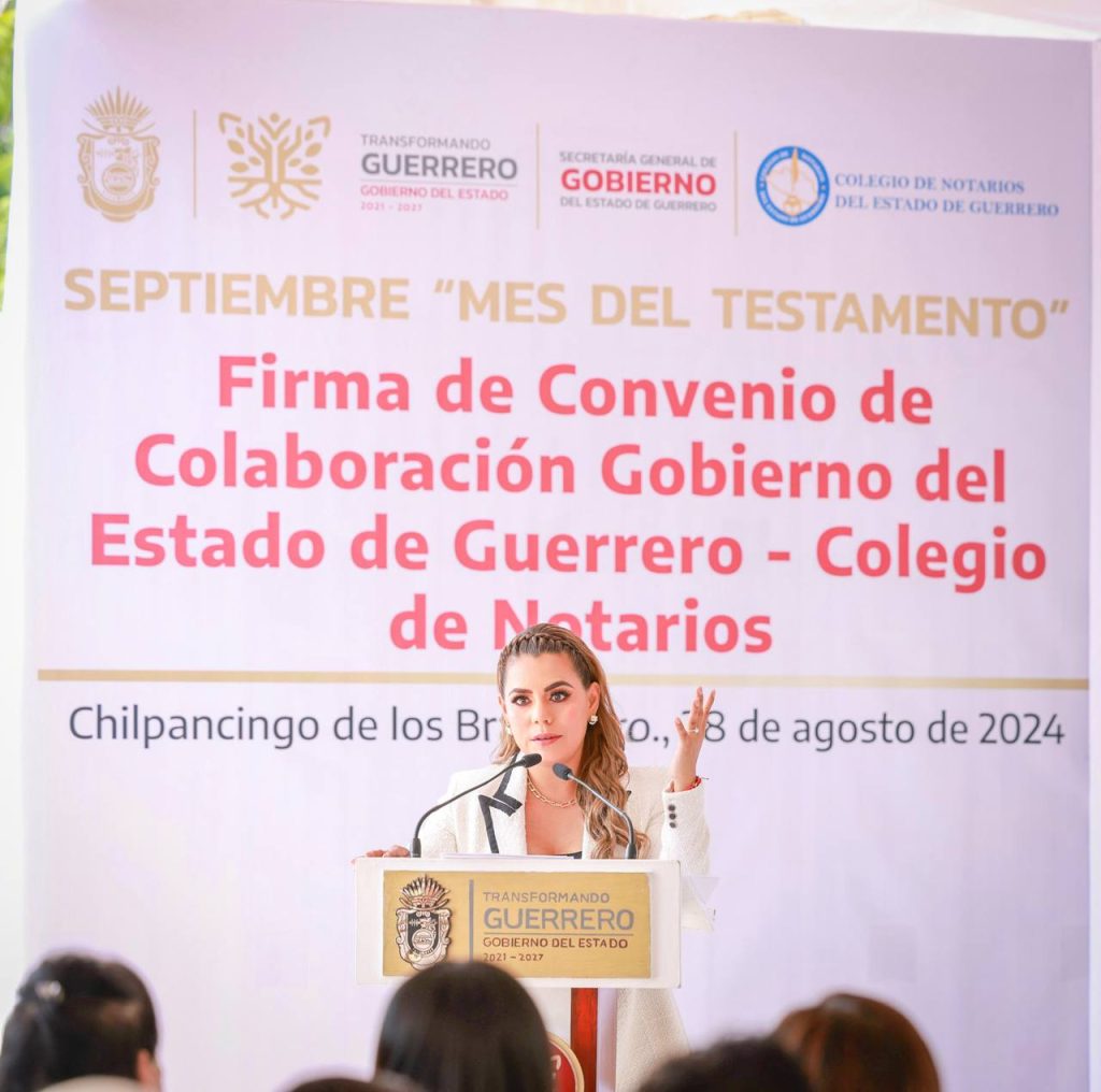 Chilpancingo, Gro., 28 de agosto del 2024.- La gobernadora Evelyn Salgado Pineda firmó un convenio con el Colegio de Notarios de Guerrero para fomentar la cultura testamentaria y proteger el patrimonio familiar, ofreciendo a los afiliados del Instituto Guerrerense para la Atención Integral de las Personas Adultas Mayores (IGATIPAM), la oportunidad de realizar su testamento por un costo preferencial de 500 pesos durante septiembre, el “Mes del Testamento”.