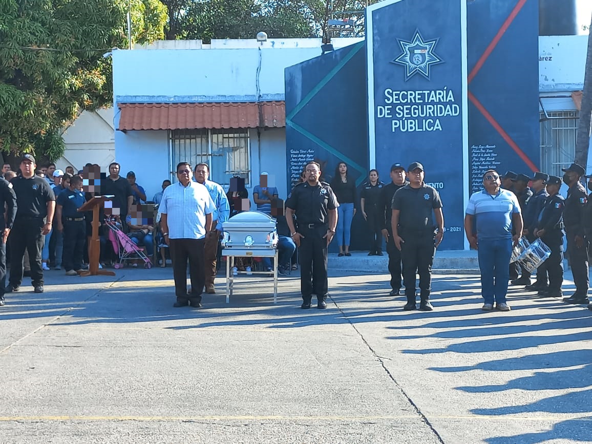 En la explanada de la corporación, se realizaron los honores fúnebres al policía que cumplió 16 años de servicio activo en la Policía Preventiva; en representación del secretario de Seguridad Pública, Adrián Olivas Franco, la secretaria Técnica expresó sus condolencias a la familia, destacó las acciones de su compañero, su entrega y sacrificio.