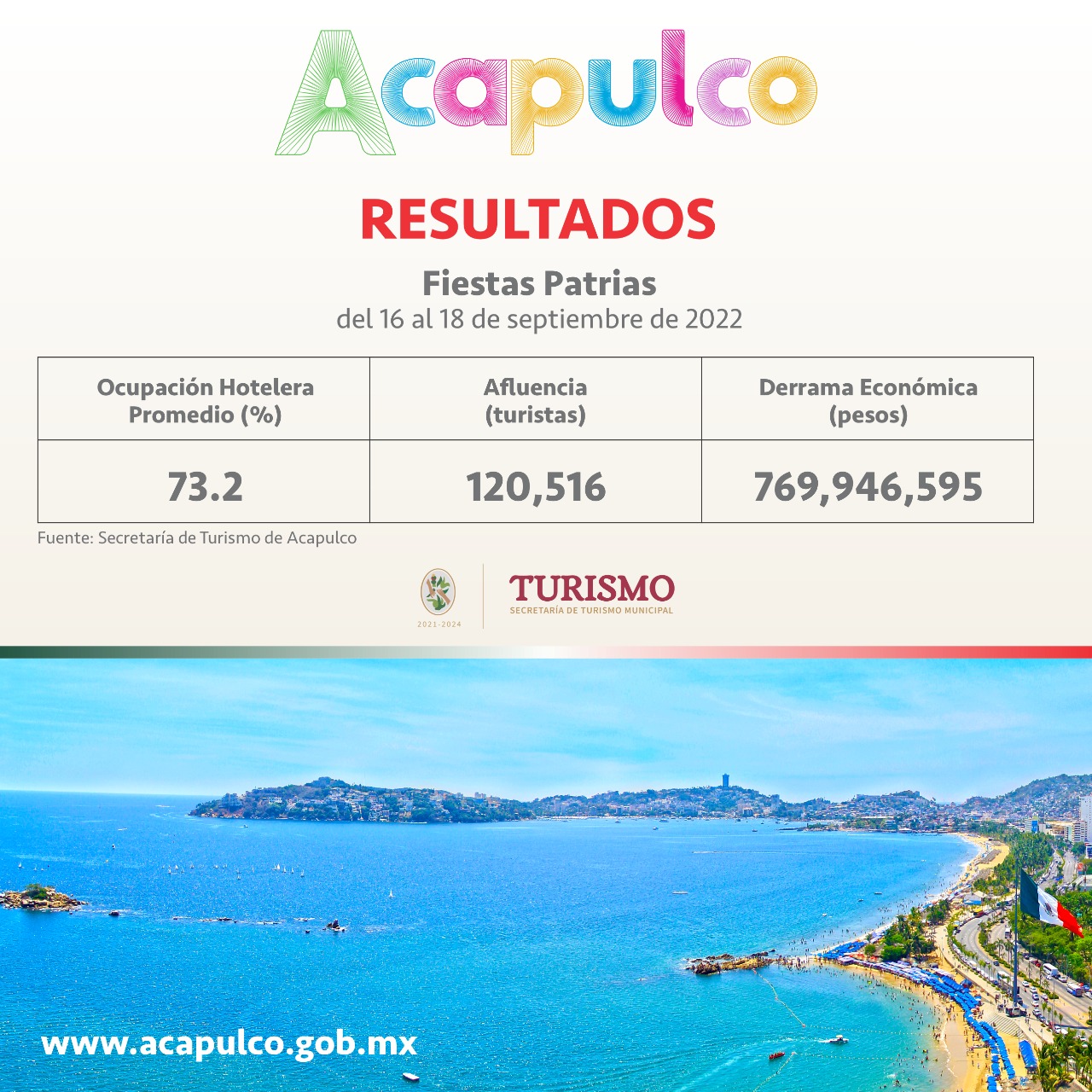 Acapulco, Gro., 19 de septiembre de 2022.- Miles de turistas visitaron el puerto de Acapulco para disfrutar del fin de semana largo que fue del 16 al 18 de septiembre con motivo de las fiestas patrias, lo que dejó una derrama económica de 769 millones 946 mil 595 pesos.