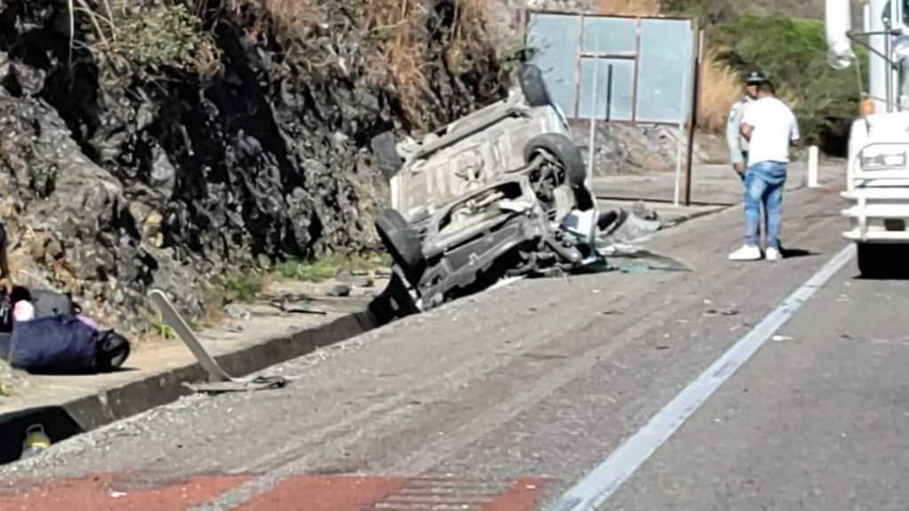 Versiones policiacas indican que un vehículo de la marca Nissan tipo Sentra y un automóvil Volkswagen chocaron, lo que provocó que uno se volcara y quedara a un costado de la carretera.