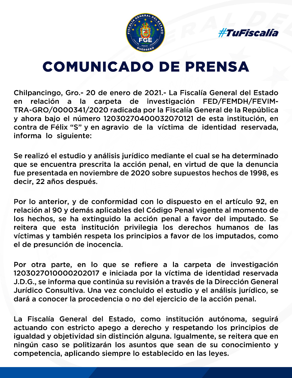 Chilpancingo, Gro., 20 de enero de 2021.- La Fiscalía General del Estado (FGE) informó que ya prescribió el presunto delito de violación imputado en contra de Felix Salgado Macedonio.