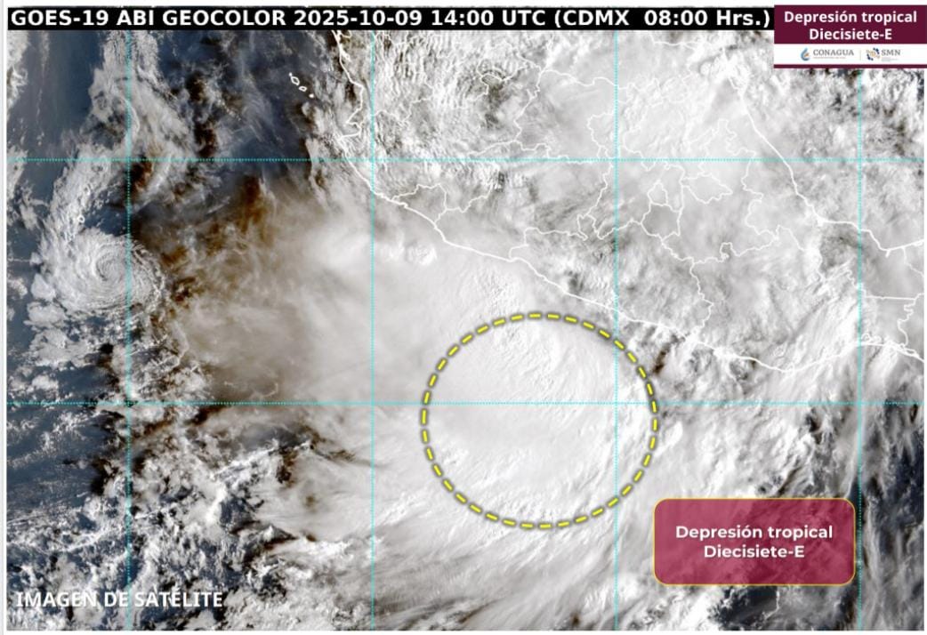 Una zona de baja presión frente a las costas de Guerrero evolucionó a depresión tropical Diecisiete-E, con potencial de provocar lluvias intensas y condiciones meteorológicas de riesgo en distintas regiones del estado.