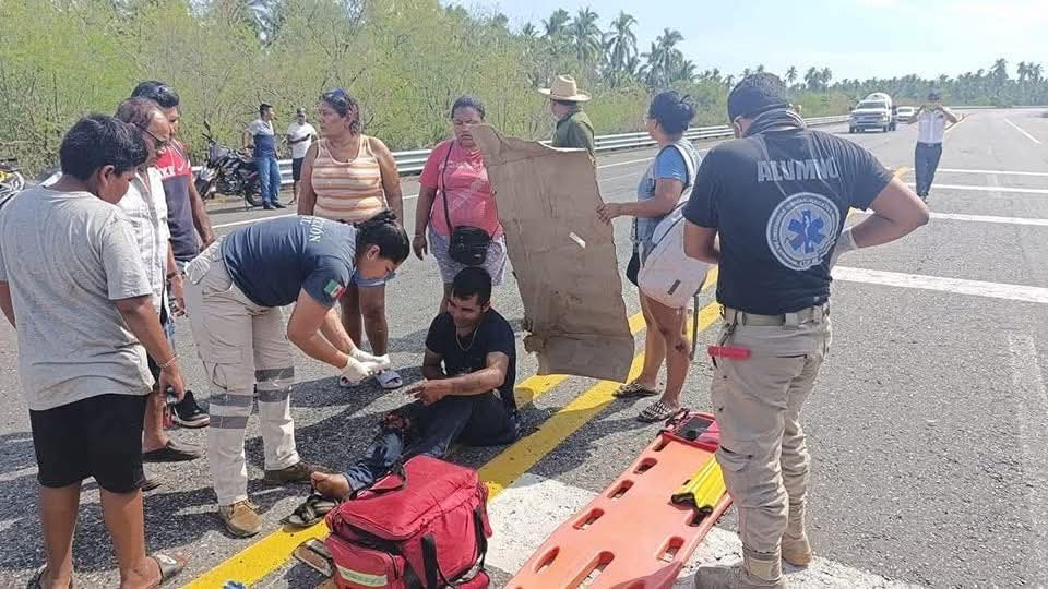 Coyuca de Benitez, Gro; 29 de mayo de 2025.- Un joven motociclista derrapó esta tarde sobre un tramo de la carretera federal Acapulco-Zihuatanejo a la altura del acceso a la localidad El Zapote.