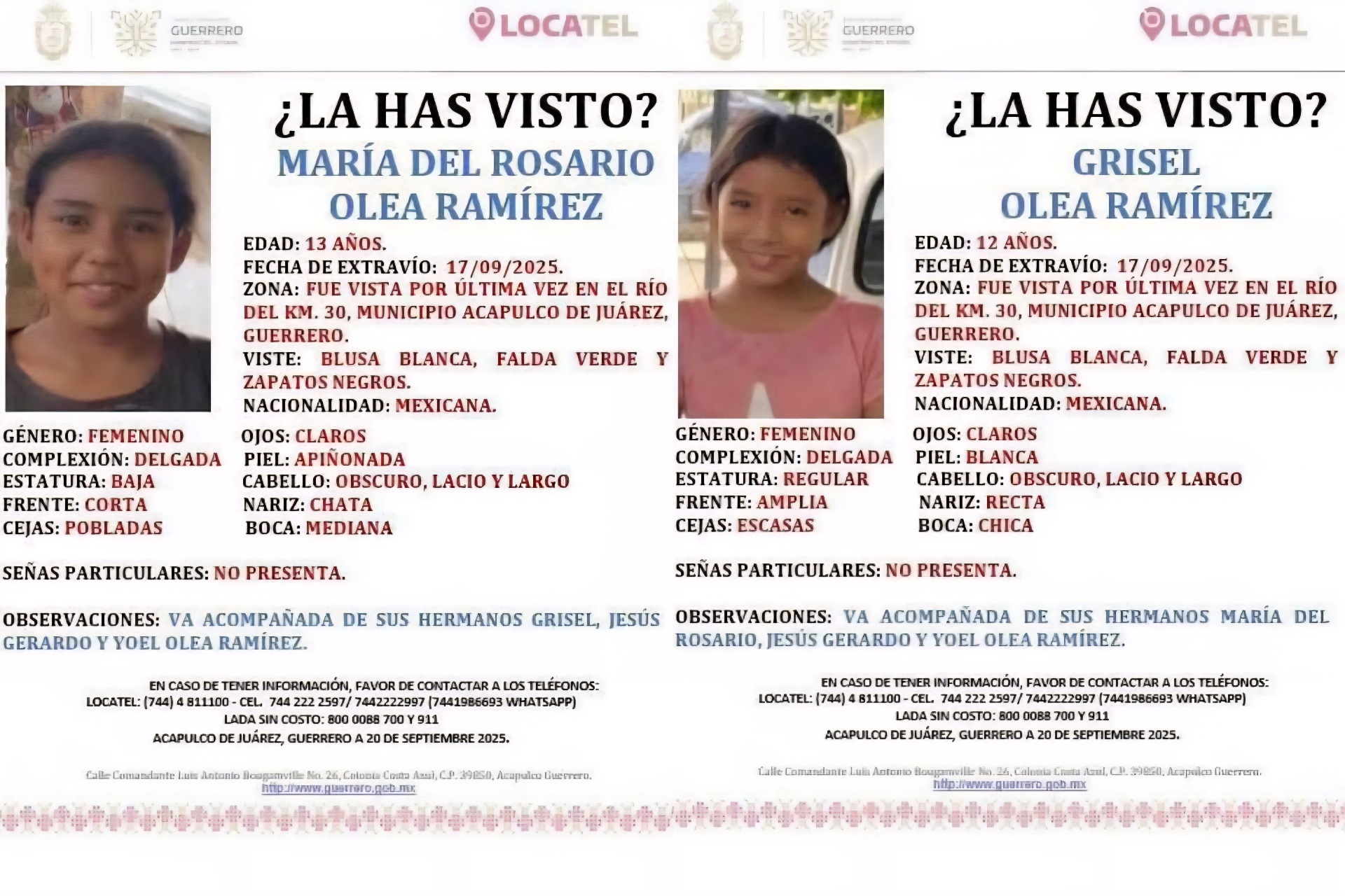 Tras la denuncia de su desaparición, autoridades activaron los protocolos de búsqueda correspondientes y Locatel Guerrero emitió sus fichas de búsqueda el pasado sábado 20 de septiembre.