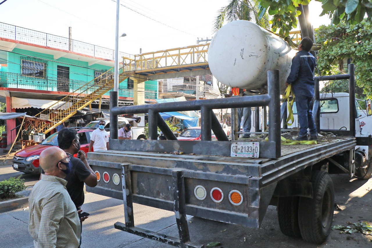 El personal de Protección Civil realizó el desmantelamiento de tuberías y del tanque con capacidad de dos mil 100 litros que este centro de carburación utilizaba para la venta del combustible y, con apoyo de una grúa se retiró el tanque estacionario que almacenaba gas LP.