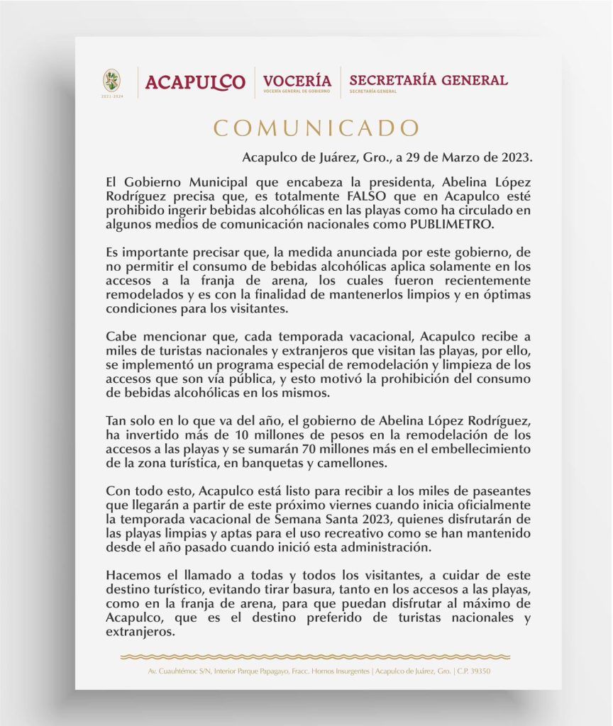 “Es importante precisar que, la medida anunciada por este gobierno, de no permitir el consumo de bebidas alcohólicas aplica solamente en los accesos a la franja de arena, los cuales fueron recientemente remodelados y es con la finalidad de mantenerlos limpios y en óptimas condiciones para los visitantes”, se puede leer en el comunicado.