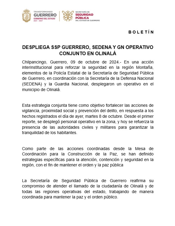 La Secretaría de Seguridad Pública de Guerrero reafirma su compromiso de atender el llamado de la ciudadanía de Olinalá y de todas las regiones operativas del estado, trabajando de manera coordinada para mantener la paz y el orden público.