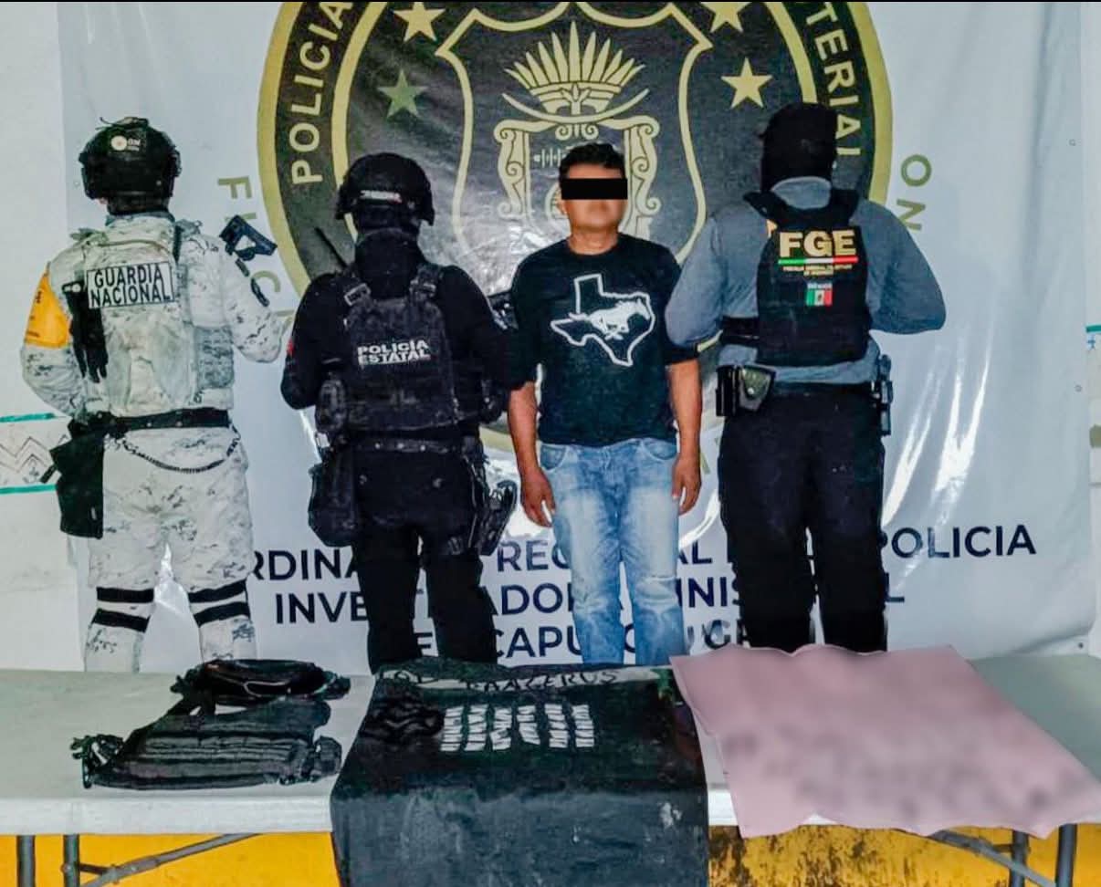 Chilpancingo, Gro., a 27 de junio de 2025.- La Fiscalía General del Estado de Guerrero (FGE Guerrero), en coordinación con elementos de la Secretaría de la Defensa Nacional (DEFENSA), la Guardia Nacional (GN), la Secretaría de Seguridad y Protección Ciudadana (SSPC) y la Secretaría de Seguridad Pública del Estado de Guerrero (SSPGro), detuvo en flagrancia a Gerardo “N”, en el municipio de Acapulco de Juárez.