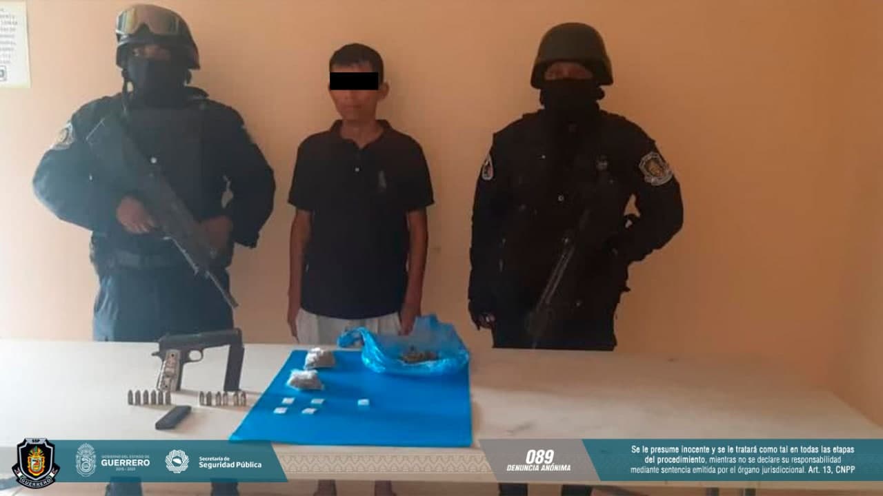 Chilpancingo, Guerrero, 10 de febrero de 2021.- Elementos del Grupo Táctico de Reacción Inmediata “Centauro” de la Policía Estatal detuvieron a un hombre, a quien le aseguraron presunta droga, un arma de fuego, cargadores y cartuchos en el municipio de Acapulco.