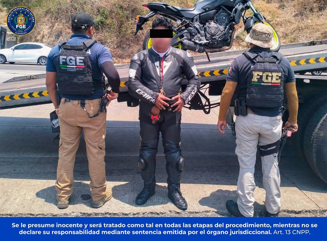 Chilpancingo, Gro., a 17 de mayo de 2025.— La Fiscalía General del Estado de Guerrero (FGE Guerrero) informa que, en el marco del operativo “Acamoto 2025”, fue detenido en flagrancia un masculino identificado como Edgar “N”, en posesión de una motocicleta con reporte de robo vigente, en el municipio de Acapulco de Juárez.