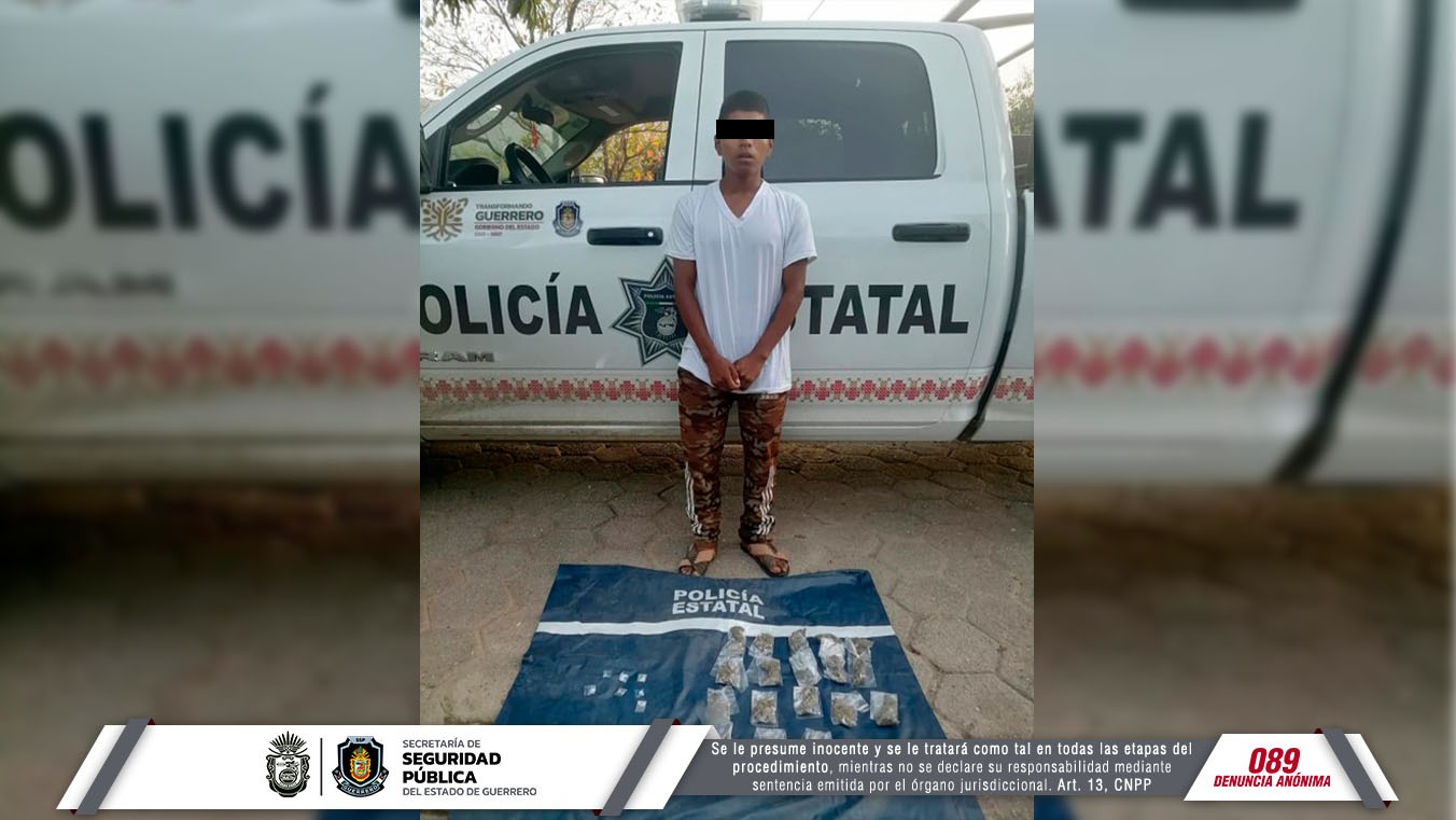 Chilpancingo, Guerrero, 21 de febrero de 2023.- Personal de la Policía Estatal detuvo a un individuo en posesión de posible droga, esto como resultado de las acciones de vigilancia en el municipio de Acapulco.