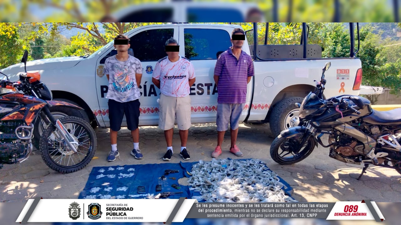 Chilpancingo, Guerrero, 09 de diciembre de 2022.- En acciones de seguridad y prevención del delito, personal de la Policía Estatal detuvo a tres personas en posesión de presunta droga y dos armas de fuego en el municipio de Acapulco.