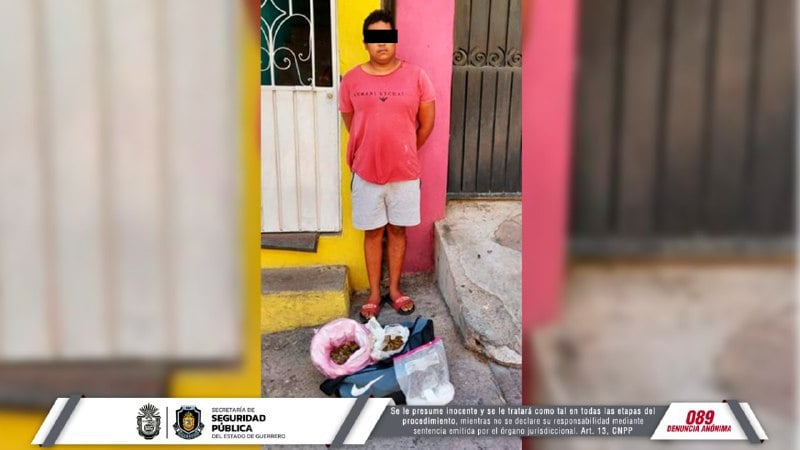 La persona fue identificada como Luis “N”, a quien se le localizaron dos bolsas de plástico transparentes con hierba verde, con características de la marihuana, así como dos bolsas más con sustancias sólidas, similar a la droga conocida como “cristal”.