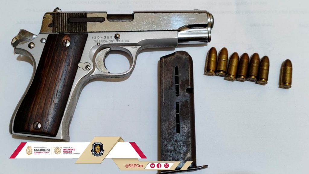 Tras una revisión se les localizó en posesión de una pistola corta, un cargador abastecido y siete cartuchos.
