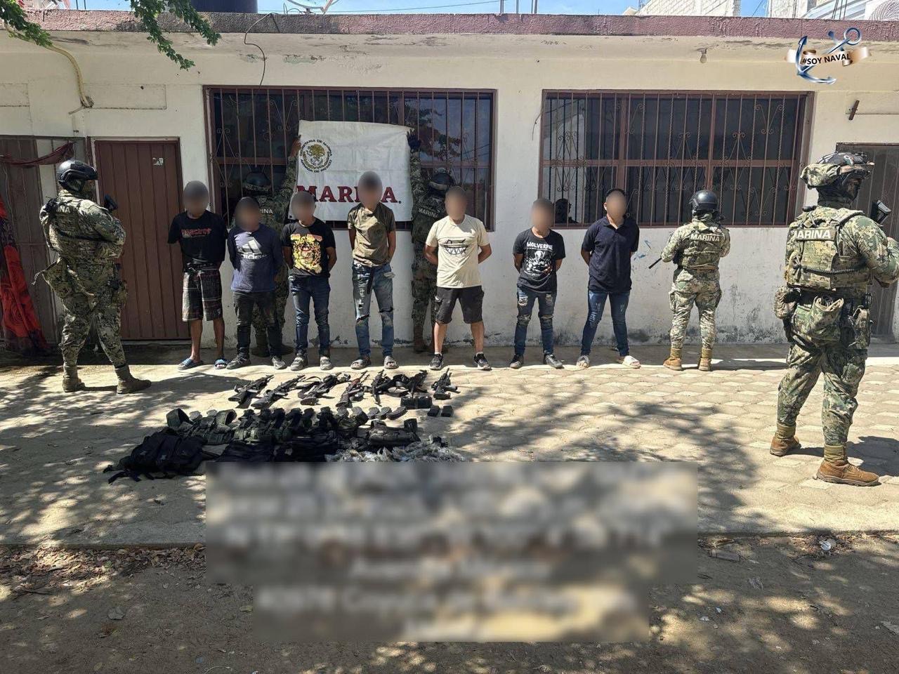 Lo anterior se llevó a cabo durante un recorrido de disuasión y vigilancia efectuado por personal de Infantería de Marina, con apoyo de un helicóptero Black Hawk para efectuar el reconocimiento y cobertura en el área de operaciones, lo que dio como resultado la detención de siete hombres. Asimismo, se aseguraron siete fusiles, 16 cargadores, un magazín (para almacenamiento de municiones), un chaleco táctico con placas, tres chalecos adicionales sin placas, tres pecheras tácticas, 188 dosis de marihuana y cuatro motocicletas.