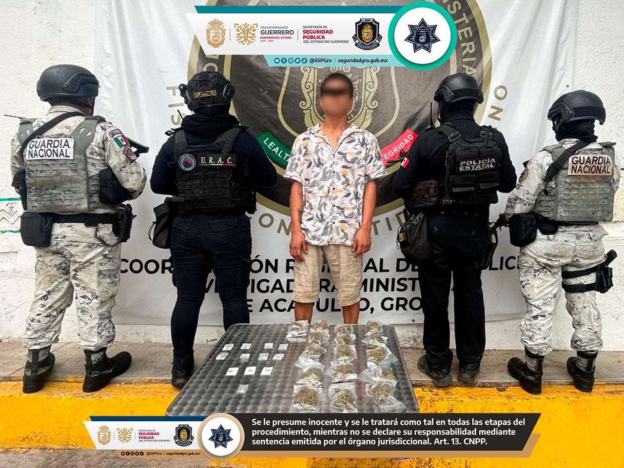 Acapulco, Guerrero, 10 de junio de 2025.– Como resultado de acciones conjuntas de seguridad, elementos de la Policía Estatal, Ejército Mexicano, Guardia Nacional y Fiscalía General del Estado detuvieron a un masculino en posesión de presuntas sustancias ilícitas en el municipio de Acapulco.