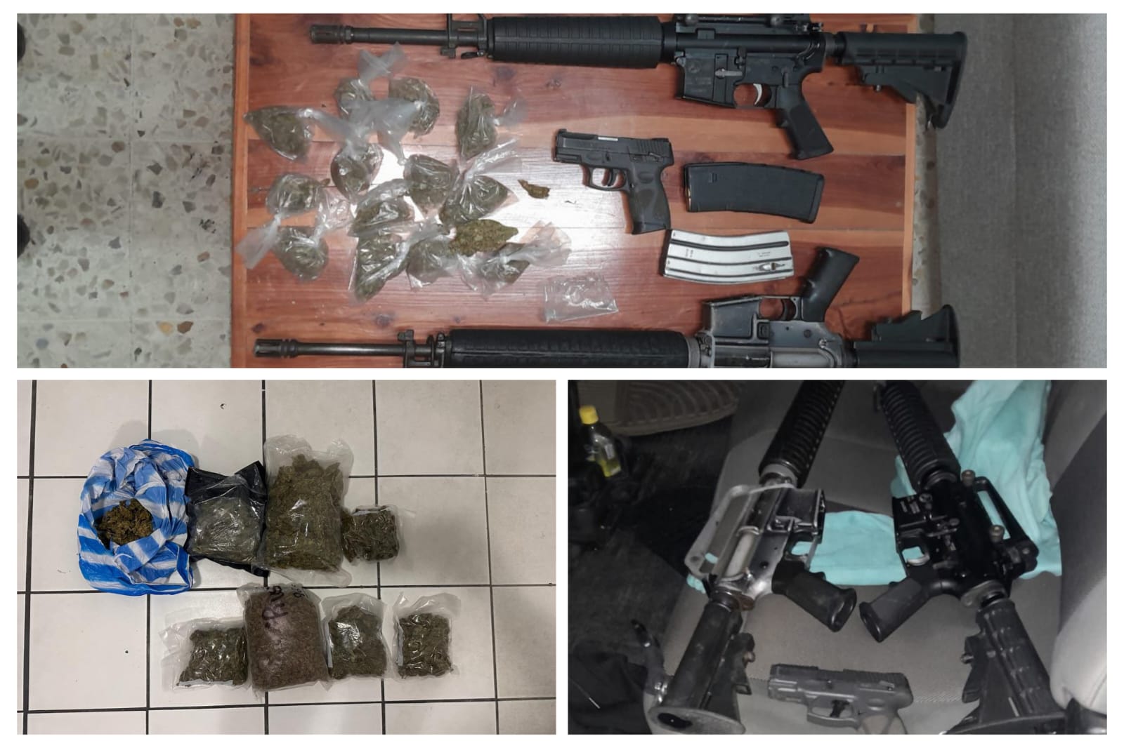 A quienes se les aseguraron, dos armas largas, una corta, 14 bolsas de plástico que en su interior contenían hierba verde seca con las características propias de la marihuana y un vehículo.