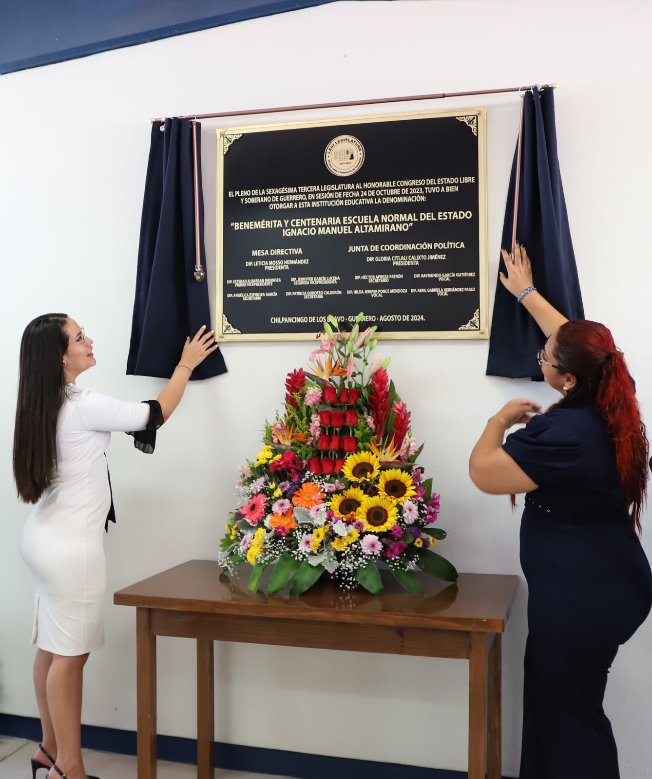 Chilpancingo, Gro., 26 de agosto de 2024.- Durante la develación de la placa conmemorativa que denomina como “Benemérita” a la Centenaria Escuela Normal del Estado Ignacio Manuel Altamirano, la diputada Gloria Citlali Calixto Jiménez, presidenta de la Junta de Coordinación Política, refrendó el compromiso del Congreso del Estado de continuar apoyando, desde su ámbito de competencia, todo lo relacionado a políticas y programas para que Guerrero tenga una mejor educación.
