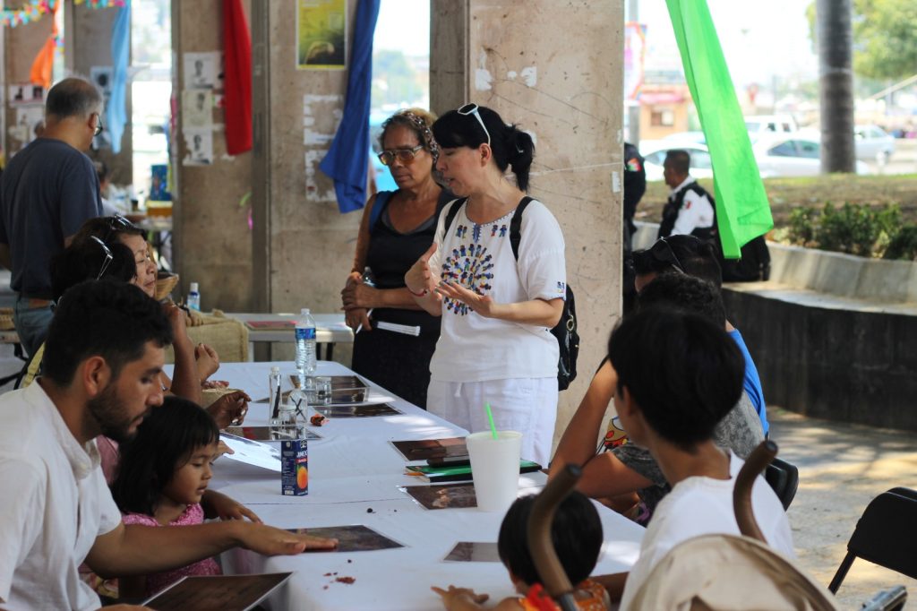 A un costado del escenario, las niñas y niños disfrutaron del Taller de Letras y Chocolate, impartido por Ernesto Lumbreras y Susana Herrera, quienes brindaron una explicación sobre el proceso de preparación del chocolate y los asistentes se llevaron una tableta preparada en esta actividad.