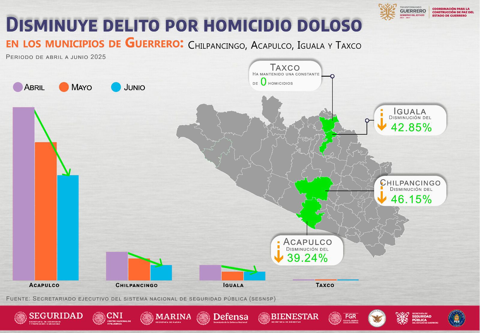 Acapulco, Gro., 4 de julio de 2025.– El estado de Guerrero continúa consolidando avances en materia de seguridad pública al registrar una disminución del 34.9 por ciento en los homicidios dolosos durante el segundo trimestre del año, en el comparativo mensual, de acuerdo con datos del Secretariado Ejecutivo del Sistema Nacional de Seguridad Pública (SESNSP).