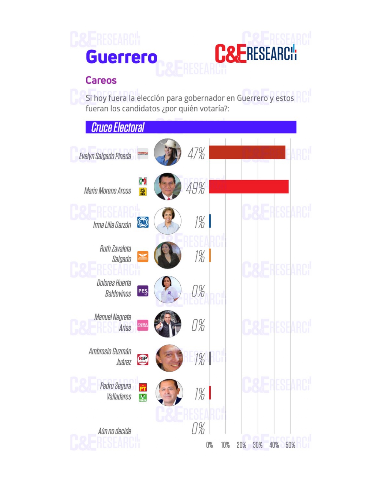 El resultado de la encuesta de “C&E Research”, publicada en este día, ubicó a Mario Moreno con el 49 por ciento de la preferencia electoral, mientras que Evelyn Salgado con el 47 por ciento, es decir, dos puntos menos.