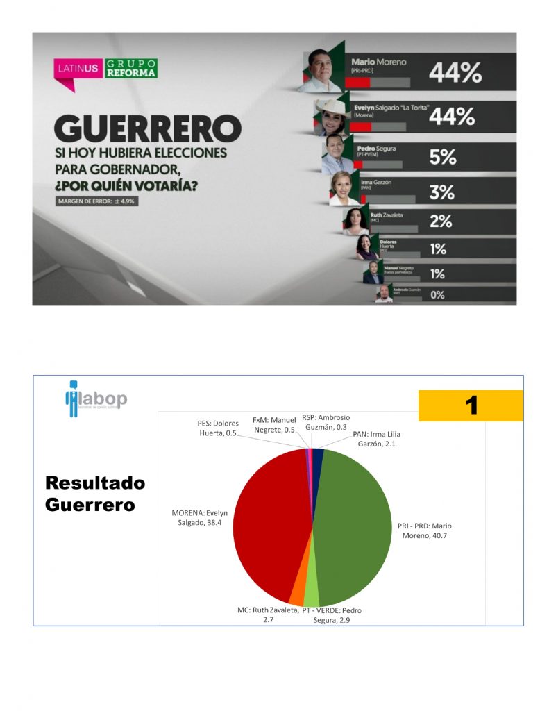 Ademas, la encuestadora “Ilabop” coloca también a Mario Moreno, del PRI-PRD, con el 40.7 por ciento, mientras que Morena y Evelyn Salgado con un 38.4 por ciento.