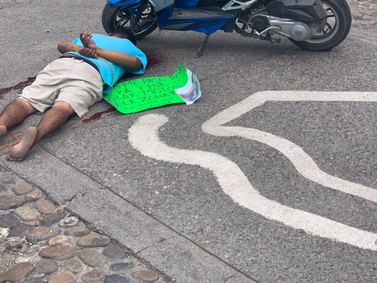 Bajo el cuerpo se apreció una cartulina verde con un mensaje que lo relacionaba con el robo de motocicletas, y a su lado una motoneta azul tipo Itálika.