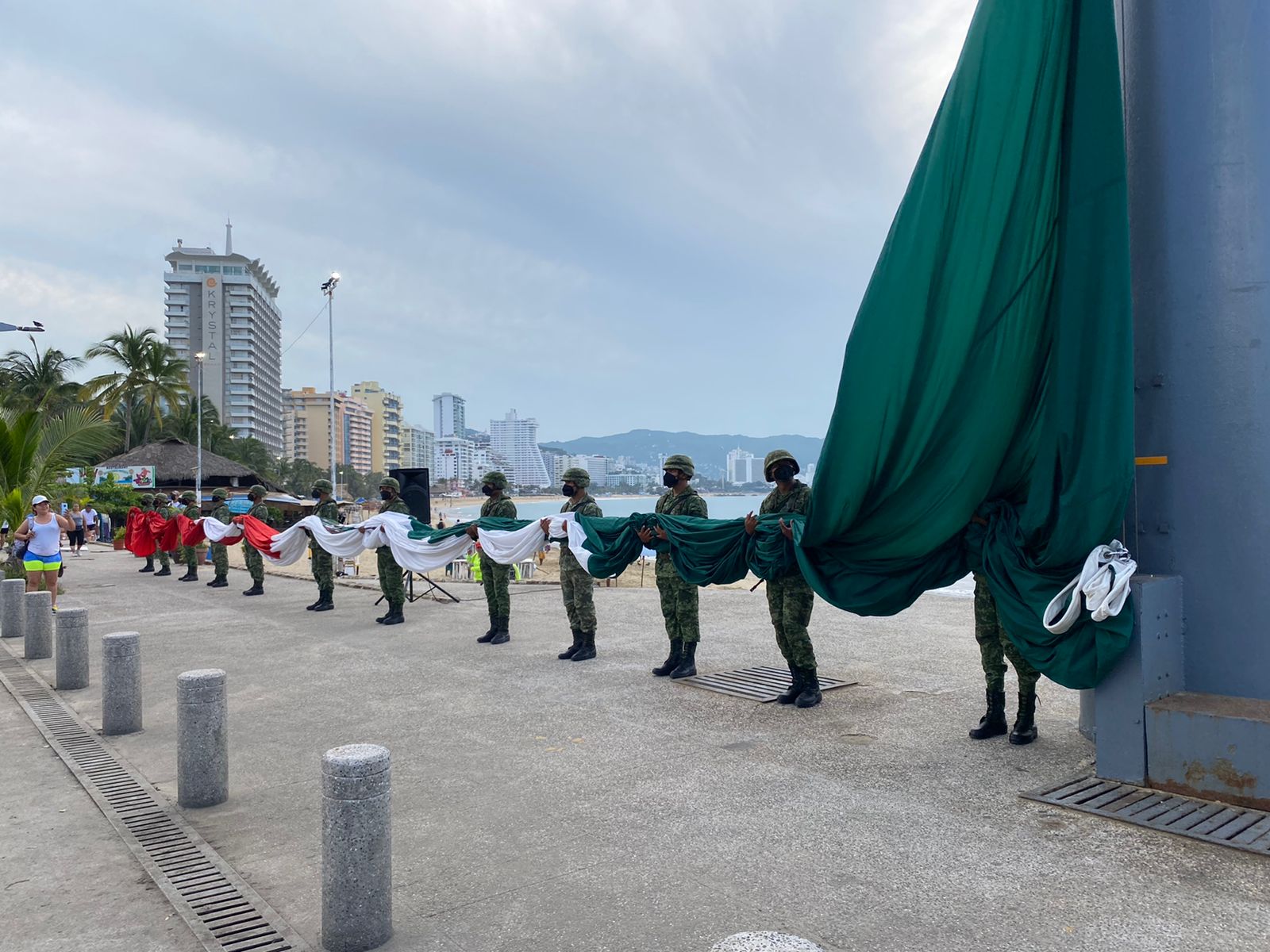 Acapulco, Gro., a 29 de julio de 2022.- Desde muy temprana hora, elementos del Ejército Mexicano comenzaron a arribar a la zona del asta bandera para realizar el izamiento a la bandera tricolor en este emblemático punto del puerto de Acapulco.