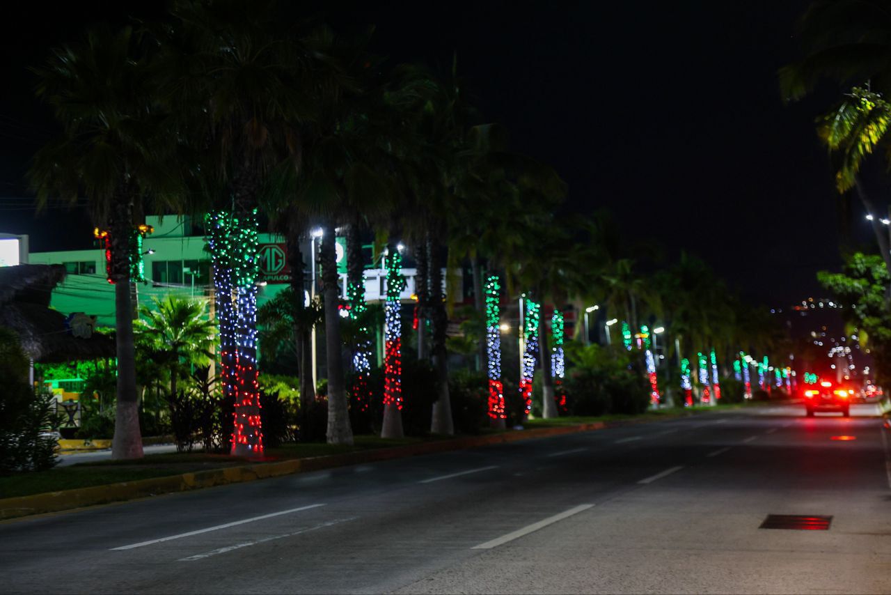 Previo al arribo de miles de vacacionistas que llegarán al puerto de Acapulco con motivo de los festejos por el 15 de septiembre, y con el objetivo de seguir mostrando un Acapulco de pie, el gobierno del estado ha colocado pendones tricolores y 135 mil focos de iluminación led, con colores verde, blanco y rojo, para adornar las palmeras del camellón central de la zona Diamante.