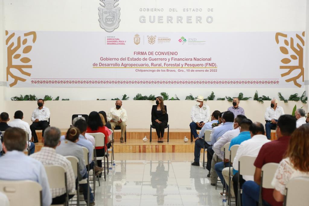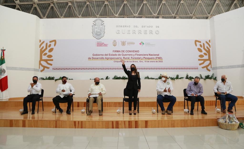 Chilpancingo, Gro., 10 de enero del 2022.- Los campesinos guerrerenses no están solos, ahora hay un gobierno de la cuarta transformación que los respalda, este año se ejercerá un presupuesto histórico en el campo que será de 386 millones de pesos, 84 por ciento más a lo ejercido en el 2021, que fue de 209 millones de pesos, destacó la gobernadora Evelyn Salgado Pineda durante la firma de convenio entre el gobierno del estado y Nacional Financiera de Desarrollo Agropecuario, Rural, Forestal y Pesquero.