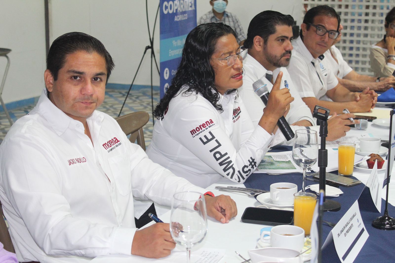 Ante los empresarios, la abanderada morenista reiteró el llamado a trabajar de manera conjunta sociedad y gobierno para lograr mejorar y sacar adelante a Acapulco.
