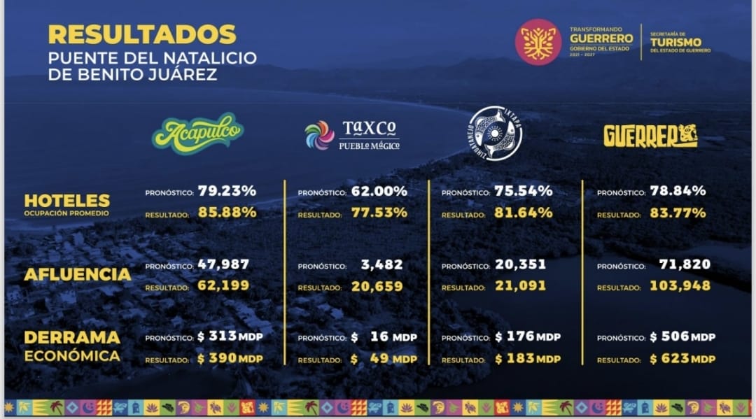 En tanto, Taxco de Alarcón destacó entre los destinos ancla al superar el pronóstico de ocupación hotelera, registrando un promedio general de 77.5 por ciento, la visita de 20 mil 659 turistas y una derrama económica de 49 millones de pesos.
