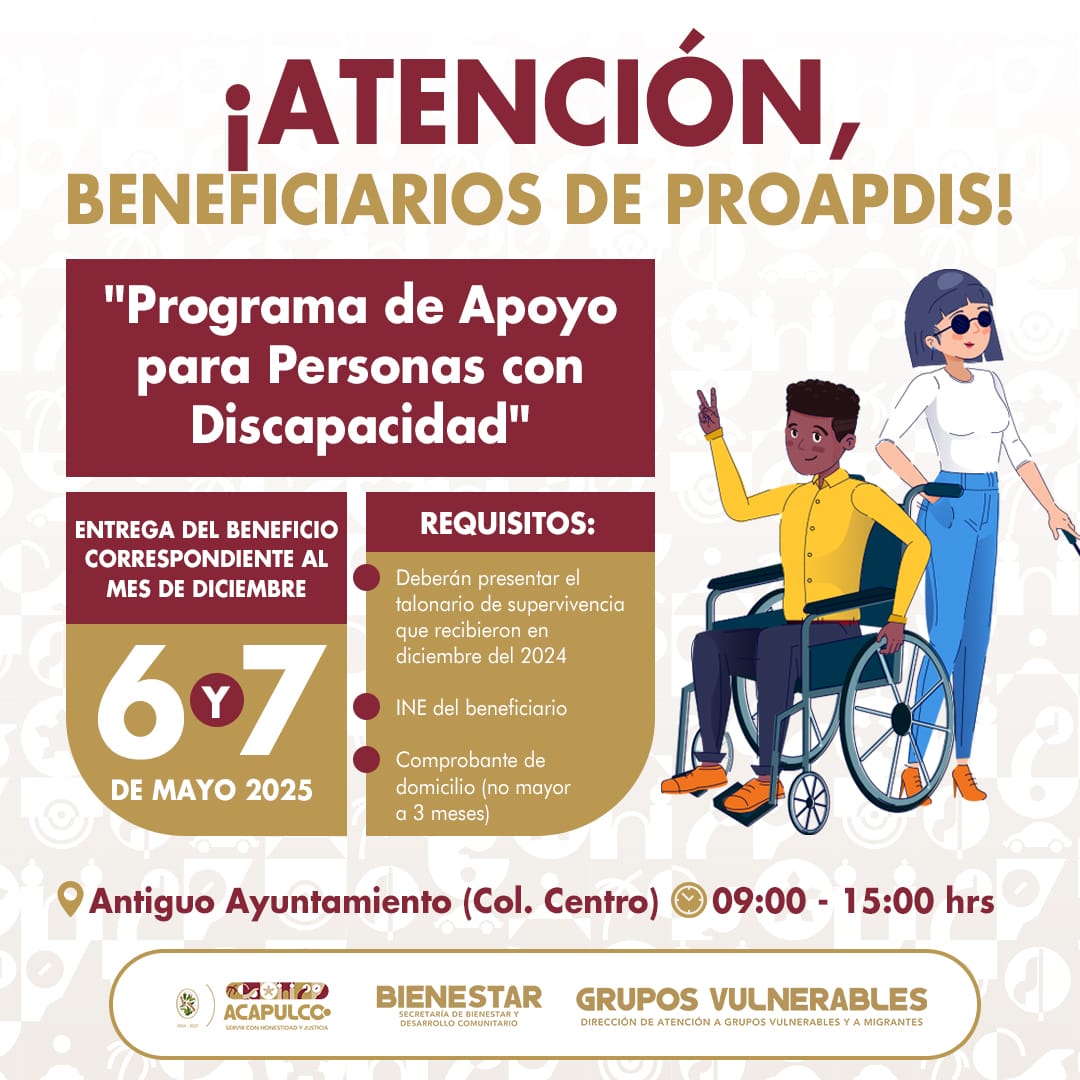 Acapulco, Gro., 01 de mayo de 2025.- El Gobierno Municipal de Acapulco que preside Abelina López Rodríguez realizará la entrega del Programa de Apoyo para Personas con Discapacidad (PROAPDIS).