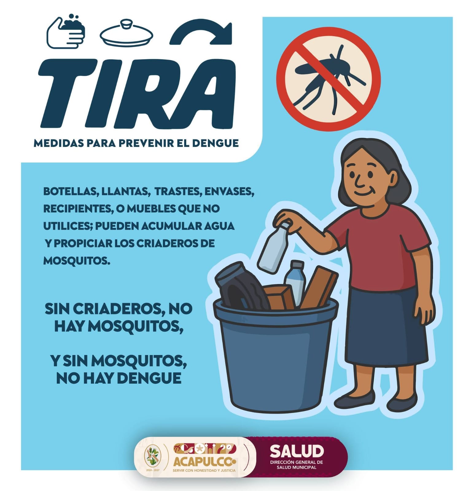 Acapulco, Gro., 04 de agosto de 2025.- La Dirección General de Salud Municipal exhorta a la población a aplicar medidas preventivas en sus hogares para evitar la proliferación del mosquito Aedes aegypti, transmisor del dengue, zika y chikungunya, ante la temporada de lluvias y el incremento de criaderos en zonas urbanas y suburbanas.