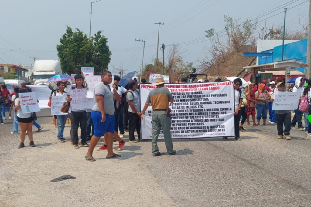Acapulco; Gro.- Alumnos y personal docente de la escuela popular Pablo Sandoval Ramírez ubicada en el poblado de Llano Largo realizaron un bloqueo total a la circulación sobre la carretera federal Cayaco-Puerto Marqués a la altura de la colonia la Navidad.