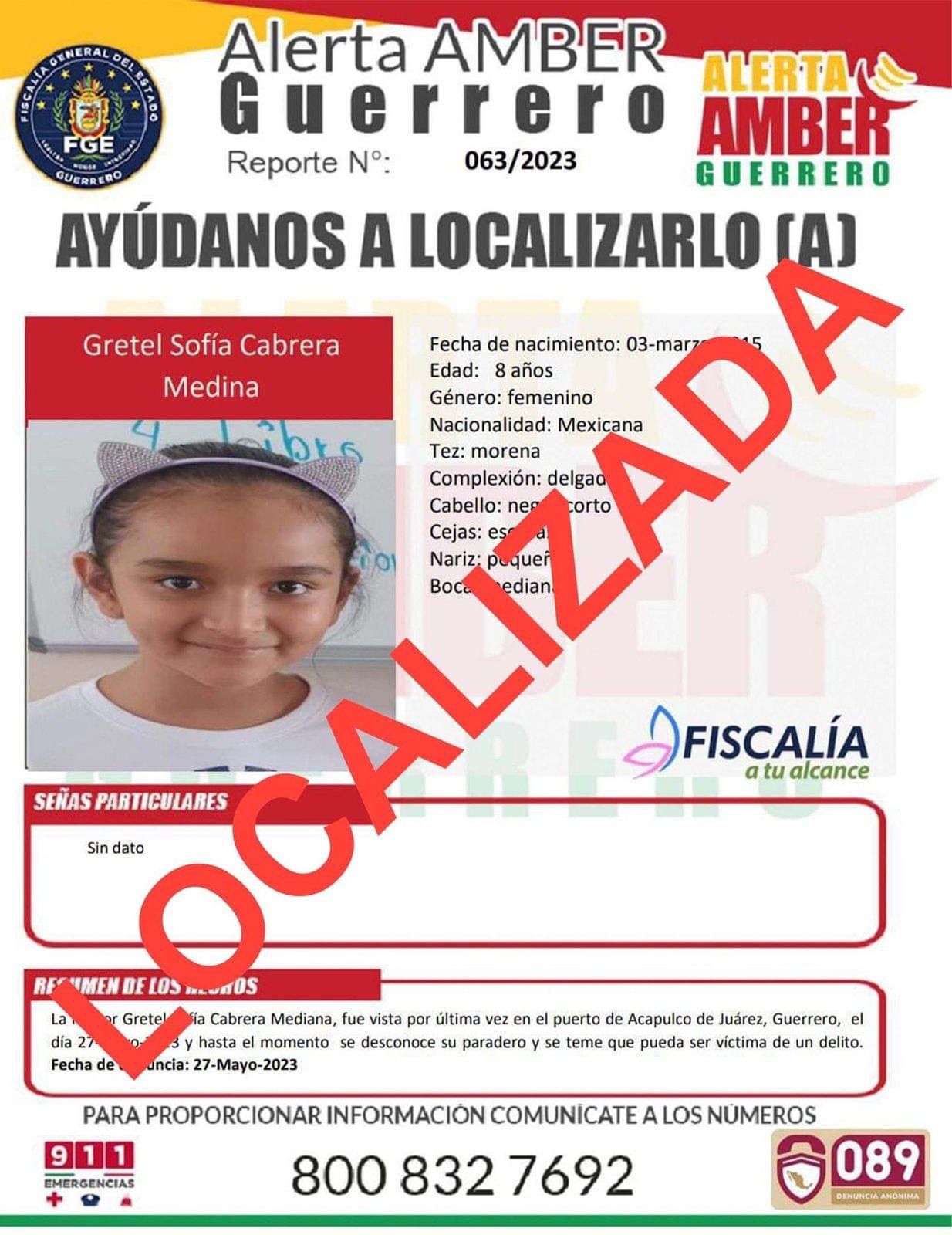 Acapulco,Gro., a 29 de mayo del 2023.-Luego de días de búsqueda y desesperación por parte de familiares y amigos de la pequeña, Gretel Sofía Cabrera Medina; esta tarde la menor reapareció sana y salva, aunque se desconocen datos de su localización.