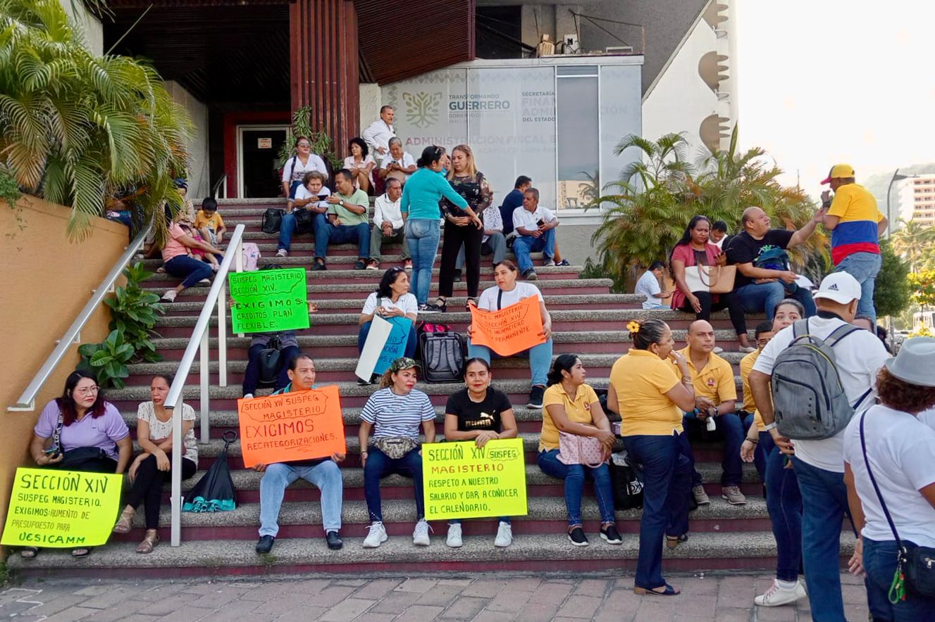 Acapulco; Gro.- Profesores adheridos a la sección 14 del Sindicato Único de Servidores Públicos del Estado de Guerrero (SUSPEG) se reunieron este jueves a las afueras de la oficina de la Administración Fiscal 01 ubicada en el Fraccionamiento Costa Azul para exigir mejoras y cumplimiento de demandas laborales.