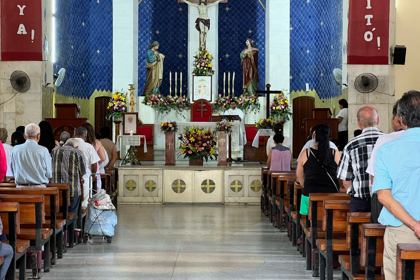 En el interior del templo principal, una imagen del Papa se colocó junto al altar, acompañada de una vela encendida, representando una luz simbólica en su tránsito hacia la vida eterna. Este sencillo altar improvisado se convirtió en un espacio de reflexión y oración para los asistentes.
