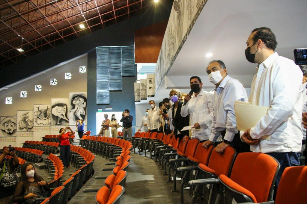 Acompañado del secretario de Finanzas y Administración, Tulio Samuel Pérez Calvo y otros secretarios de despacho, Astudillo Flores apuntó que es gratificante poder entregar la rehabilitación del Teatro María Luisa Ocampo, que es una obra que tendrá conexión con las instalaciones de la Escuela Estatal de Música.