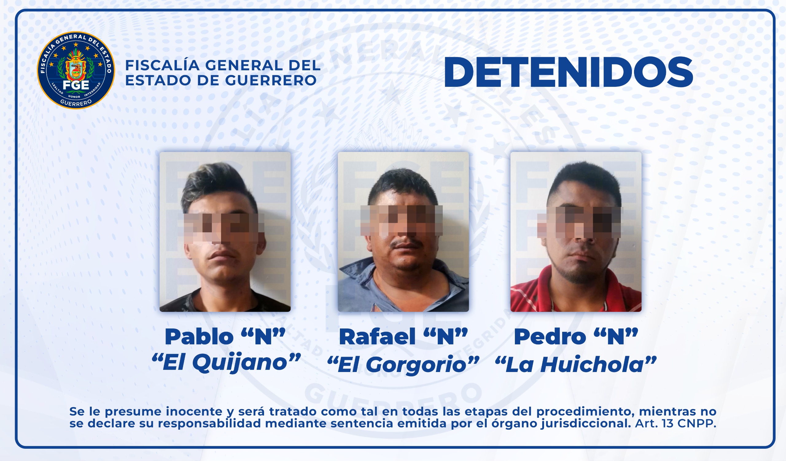 Chilpancingo, Gro. a 18 de agosto de 2024.- En acciones operativas interinstitucionales realizadas en el municipio de Teloloapan, la Fiscalía General del Estado de Guerrero (FGEGuerrero), detuvo a Rafael alias “El Gorgorio”, Pablo “N” alias “El Quijano” y Pedro “N” alias “La Huichola”, presuntos responsables de narcomenudeo y portación de arma de fuego de uso exclusivo.