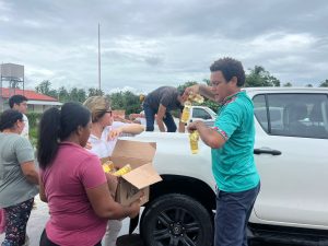 Se entregaron paquetes de agua embotellada, aceites, comida enlatada, papel higiénico, arroz, frijol, leche, jabón y más artículos de la canasta básica al presidente del DIF, Higinio Meraza Prudente.
