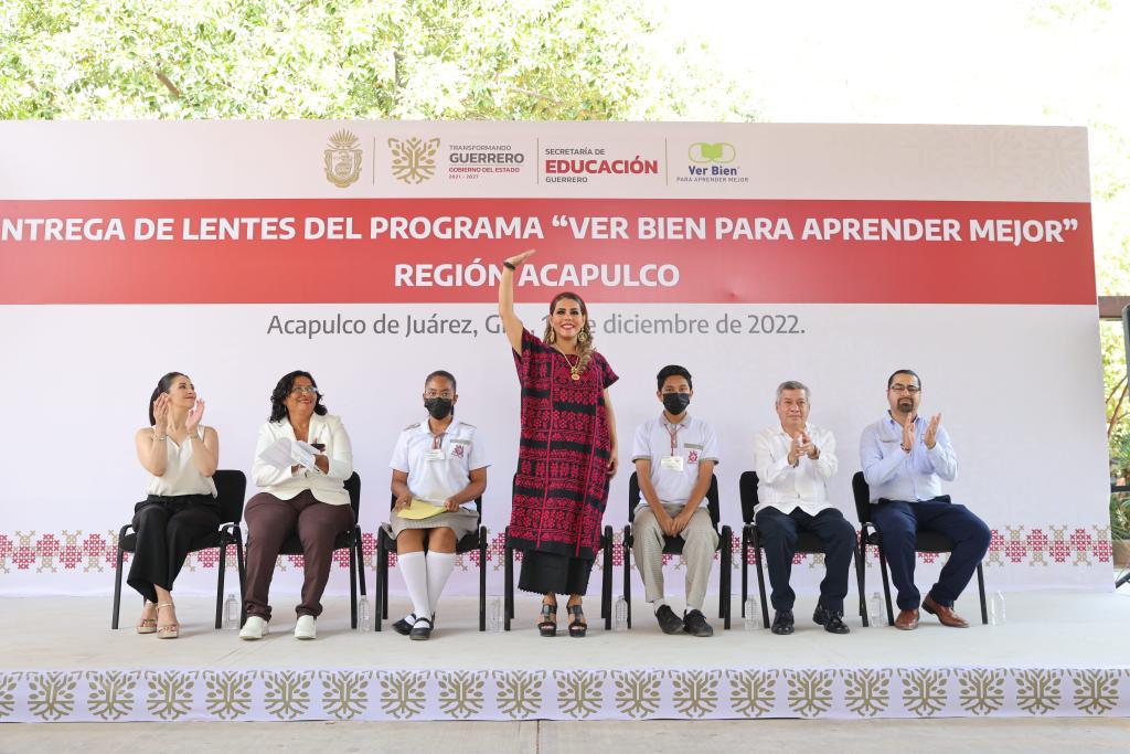 Acapulco, Gro., 13 de diciembre de 2022.- “No podemos permitir que ningún alumno, ninguna alumna, pierda la posibilidad de aprender por falta de una herramienta”, señaló la gobernadora Evelyn Salgado Pineda durante la entrega de apoyos del programa Ver Bien para Aprender Mejor, en donde se benefició a 2 mil 603 alumnos de nivel primaria y secundaria, así como de Centros de Atención Múltiple pertenecientes a la región Acapulco.